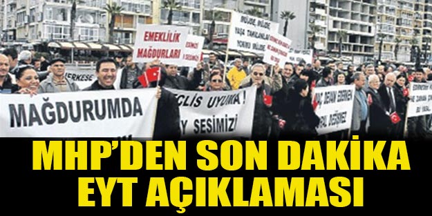 Emeklilikte yaşa takılanlar EYT sorunununu çözümü için Türkiye Büyük Millet Meclisi’nden yeni bir umut beklerken, EYT Emeklilikte yaşa takılanlar son dakika haberine göre Milliyetçi Hareket Partisi’nden (MHP) EYT konusunda yeni gelişme yaşanırken, Emeklilikte Yaşa Takılanlar Sosyal Yardımlaşma ve Dayanışma Deneğinden gelen açıklamada ise Emeklilikte yaşa takılanlara destek veren siyasi parti ve STK’lara teşekkür edilerek, EYT’lilerin bundan sonraki süreçlerde de mücadelelerinin süreceğini açıkladı.