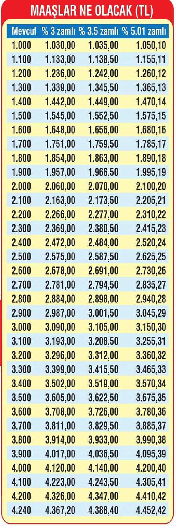 Eylül'de yıllık enflasyon ise yüzde 11.2 olarak gerçekleşti. 2017 yılı enflasyonunun da bu seviyede gerçekleşmesi halinde, 2017'nin ikinci 6 aylık dönemindeki enflasyon yüzde 5.01 çıkacak. Bu durumda da SSK ve Bağ-Kur emeklilerinin zam oranı yüzde 5.01 olacak. Maaşlarda; Ocak zammı yüzde 3 olursa 127, yüzde 3.5 olursa 148, yüzde 5.01 olursa 212 liraya varan artış gerçekleşecek. Enflasyon verileri açıklandıkça, Ocak zammına ilişkin tahminler daha da netleşecek. Kesin zam oranı ise 3 Ocak'ta duyurulacak verilerle ortaya çıkacak. Emekliler, aynı ay içerisinde zamlı maaşlarını ceplerine koyacak.