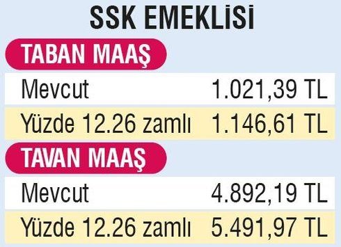 Halen en düşük emekli aylığı ek ödeme dahil bin 21 lira 39 kuruş seviyesinde. Yüzde 12.26'lık artışa göre bu maaş bin 146 lira 61 kuruşa çıkacak. Böylece bu maaşta 125,22 lira artış gerçekleşecek. En yüksek emekli aylığı ise halen 4 bin 892 lira 19 kuruş. Bu maaş da yüzde 12.26'lık zamla 5 bin 491 lira 97 kuruşa yükselecek. En yüksek maaşta 599,78 lira artış yaşanacak.