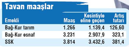 En düşük emekli maaşı (Bağ-Kur tarım) Ocak ayındaki çifte zamla 874 lira 19 kuruşa çıktı. Ancak bu maaşı alan emeklilerden Bağ-Kur kapsamında çalışmaya devam edenlerin eline bu ay yüzde 10'luk kesinti nedeniyle 786 lira 77 kuruş geçti. Böylece emekli 87 lira 42 kuruş gelir artışı elde edecek. En yüksek emekli maaşı da (SSK) Ocak ayındaki çifte zamla 3 bin 814 lira oldu. Bu emeklinin kesinti karı ise 381 lira 40 kuruş olacak.