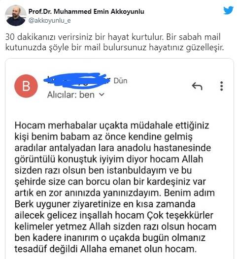 30 bin feette kalp masajı ile hayata tutunan hastanın oğlundan teşekkür maili alan Prof. Dr. Akkoyunlu o mesajı paylaştı.