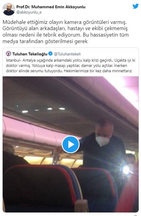 Medipol Üniversitesi Hastanesi'nde görev yapan Prof. Dr. Muhammed Emin Akkoyunlu vesile oldu, yaptığı müdahale ile uçakta kalp krizi geçiren yolcu hayata döndü.