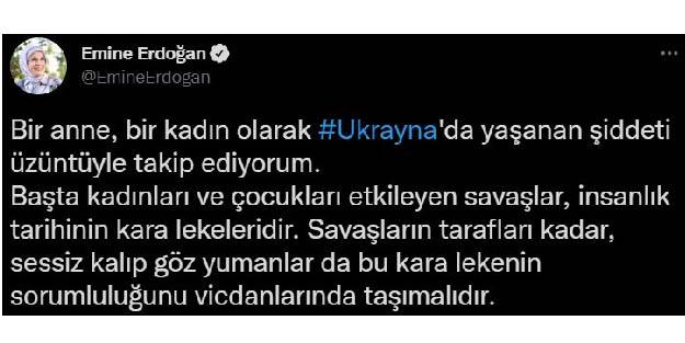 Cumhurbaşkanı Recep Tayyip Erdoğan’ın eşi Emine Erdoğan, Rusya’nın Ukrayna’ya saldırısı ile ilgili sosyal medya hesabından yaptığı paylaşımda, “Bir anne, bir kadın olarak Ukrayna'da yaşanan şiddeti üzüntüyle takip ediyorum. Başta kadınları ve çocukları etkileyen savaşlar, insanlık tarihinin kara lekeleridir. Savaşların tarafları kadar, sessiz kalıp göz yumanlar da bu kara lekenin sorumluluğunu vicdanlarında taşımalıdır. Unutmayalım savaş hep gözyaşı ve yıllarca bitmeyen yıkımlar getirir. Din, dil, ırk fark etmeksizin, hangi milletten olursa olsun mağdur ve mazlum halkların yanındayız. Allah hepsinin yardımcısı olsun. Uluslararası toplumu barışın tesisi için harekete geçmeye davet ediyorum” ifadelerini kullandı.
