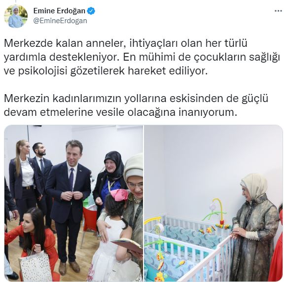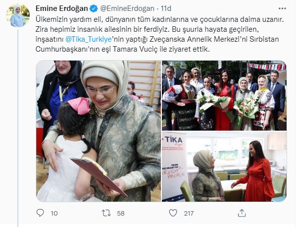Erdoğan paylaşımında, “Ülkemizin yardım eli, dünyanın tüm kadınlarına ve çocuklarına daima uzanır. Zira hepimiz insanlık ailesinin bir ferdiyiz. Bu şuurla hayata geçirilen, inşaatını @Tika_Turkiye’nin yaptığı Zveçanska Annelik Merkezi’ni Sırbistan Cumhurbaşkanı'nın eşi Tamara Vuciç ile ziyaret ettik. Merkezde kalan anneler, ihtiyaçları olan her türlü yardımla destekleniyor. En mühimi de çocukların sağlığı ve psikolojisi gözetilerek hareket ediliyor. Merkezin kadınlarımızın yollarına eskisinden de güçlü devam etmelerine vesile olacağına inanıyorum” dedi.