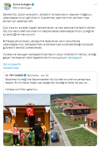 Cumhurbaşkanı Recep Tayyip Erdoğan'ın eşi Emine Erdoğan, Gaziantep'in Nurdağı ilçesinde köy tipi kalıcı afet konutlarına kavuşan depremzedelere "hayırlı olsun" dileklerini iletti.