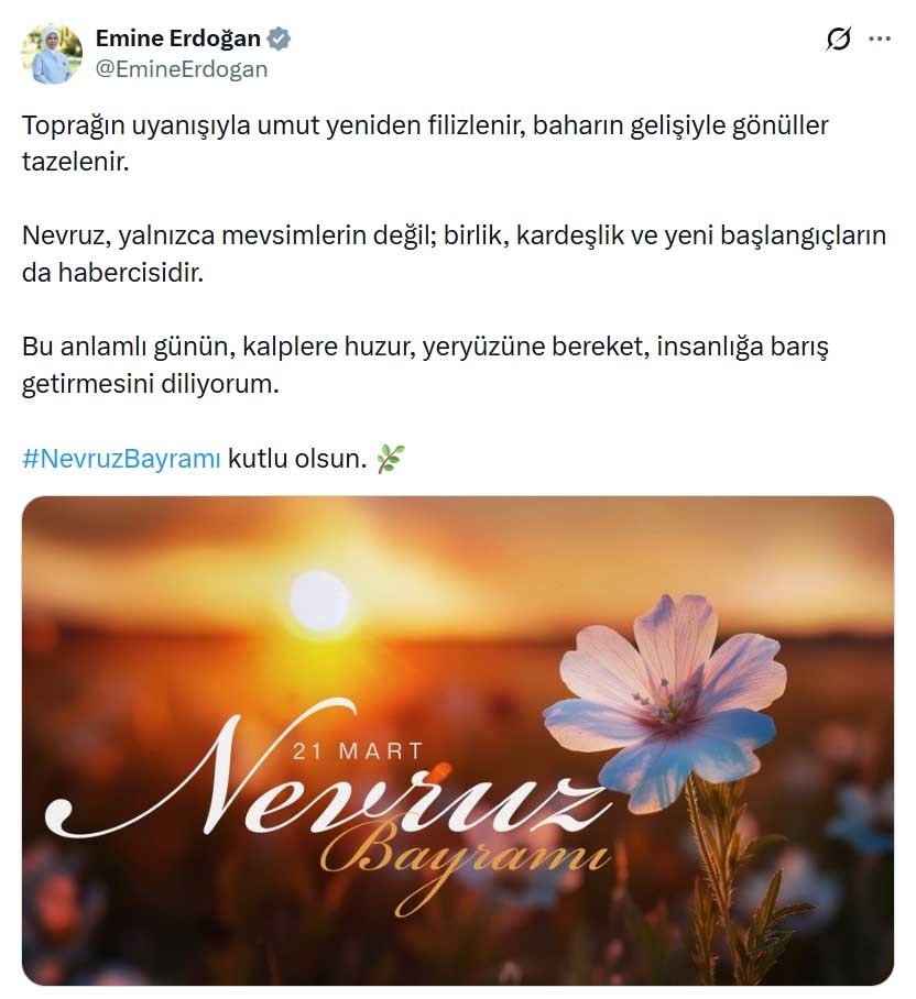 Emine Erdoğan, sosyal medya hesabından paylaştığı Nevruz Bayramı mesajında, "Toprağın uyanışıyla umut yeniden filizlenir, baharın gelişiyle gönüller tazelenir. Nevruz, yalnızca mevsimlerin değil; birlik, kardeşlik ve yeni başlangıçların da habercisidir. Bu anlamlı günün, kalplere huzur, yeryüzüne bereket, insanlığa barış getirmesini diliyorum. Nevruz Bayramı kutlu olsun" ifadelerini kullandı.