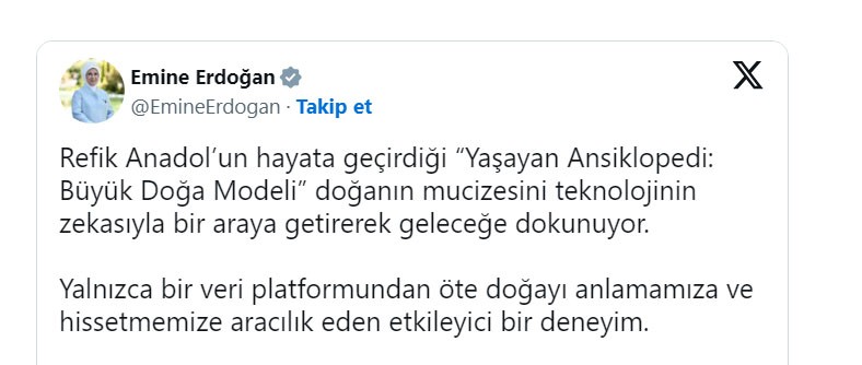 Emine Erdoğan, sosyal medya hesabından, medya sanatçısı Refik Anadol'un yeni yapay zeka platformu Living Encyclopedia: Large Nature Model'e (LNM) ilişkin paylaşımını alıntılayarak, "Refik Anadol'un hayata geçirdiği 'Yaşayan Ansiklopedi: Büyük Doğa Modeli' doğanın mucizesini teknolojinin zekasıyla bir araya getirerek geleceğe dokunuyor." ifadelerine yer verdi.