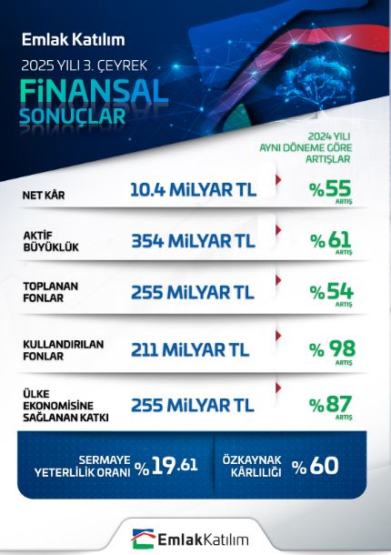 Geçtiğimiz yılın aynı dönemine göre %87 artışla ülke ekonomisine 255 Milyar TL kaynak sağlayan Emlak Katılım, aynı dönemde net kârını %55 oranında artırarak 10.4 Milyar TL’ye çıkardı. Aktif büyüklüğünü 354 Milyar TL’ye ulaştıran Emlak Katılım, toplanan fonlarını 255 Milyar TL’ye yükseltti. Aynı dönemde kullandırılan fon büyümesi %98 düzeyinde gerçekleşirken %1.46 seviyesindeki takibe dönüşüm oranı ve %19.61 sermaye yeterliliği oranı ile sektördeki sağlam duruşunu pekiştirdi. Güçlü sermaye yapısı ve etkin risk yönetimiyle desteklenen istikrarlı operasyonel faaliyetleri sayesinde 2025 yılı üçüncü çeyreğinde özkaynak kârlılığını %60 seviyesinde tamamladı.