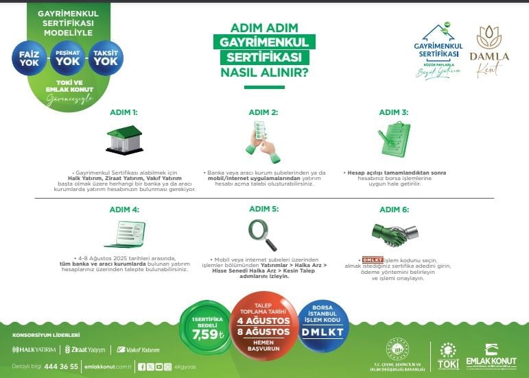 Çevre, Şehircilik ve İklim Değişikliği Bakanlığı koordinasyonunda Emlak Konut tarafından geliştirilen, SPK onayı alan geleceğin gayrimenkul finansman çözümü Gayrimenkul Sertifikası, halka arz oluyor. Sertifikalar, Borsa İstanbul’da 4-8 Ağustos 2025 tarihleri arasında “DMLKT” işlem kodu ile yatırımcılarla buluşacak. Gayrimenkul Sertifikası’nın halka arz fiyatı, değerleme fiyatı üzerinden %25 indirimle 7,59 TL olarak belirlendi. Bu model, küçük birikimlerle Damla Kent Projesi’nden ev sahibi olma fırsatı sunuyor.