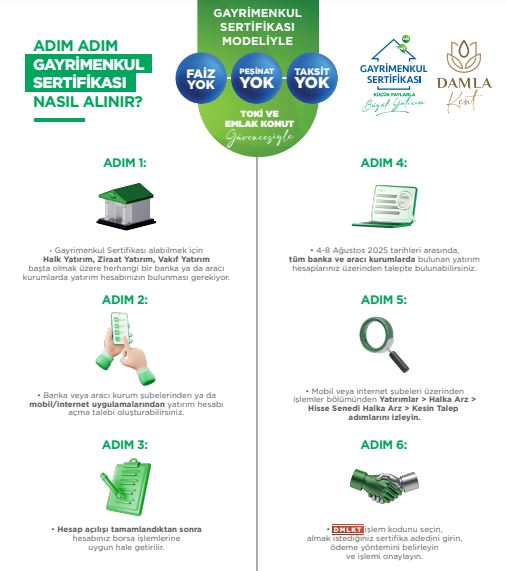 Emlak Konut güvencesiyle İstanbul’un Başakşehir ilçesinde hayata geçirilecek Damla Kent projesi, “Gayrimenkul Sertifikası” modeliyle halka arz ediliyor. 4-8 Ağustos 2025 tarihleri arasında Borsa İstanbul’da yapılacak talep toplama için Gayrimenkul Sertifikası’nın işlem kodu “DMLKT” olarak belirlendi. Gayrimenkul Sertifikası modeli, yatırımcılara küçük birikimlerle Damla Kent Projesi’nden ev sahibi olma imkânı sunuyor.