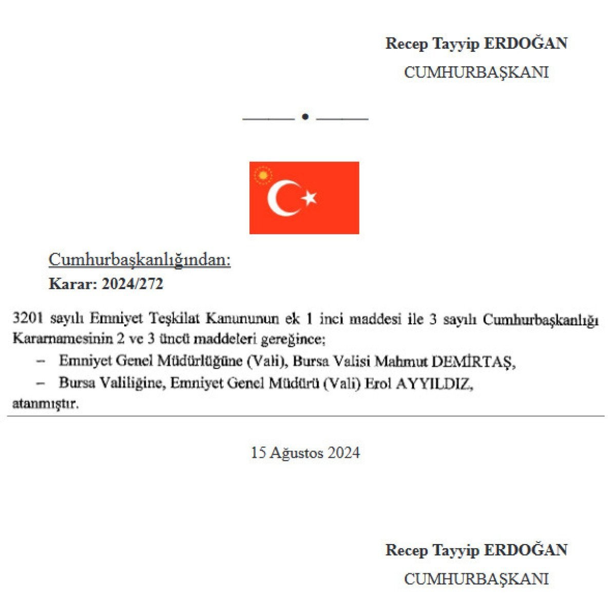 Son dakika haberine göre, yayınlanan kararla birlikte, Emniyet Genel Müdürlüğü'ne Bursa Valisi Mahmut Demirtaş atandı.