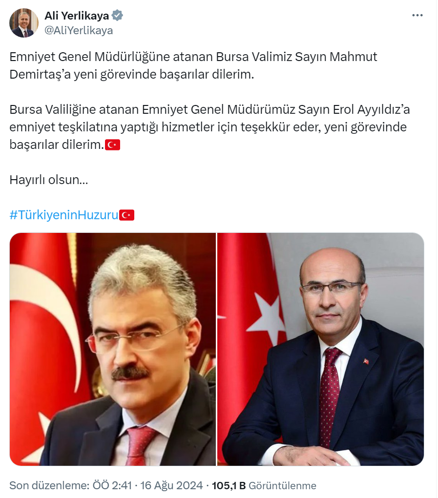 Bursa Valiliğine ise Emniyet Genel Müdürü Erol Ayyıldız atandı.