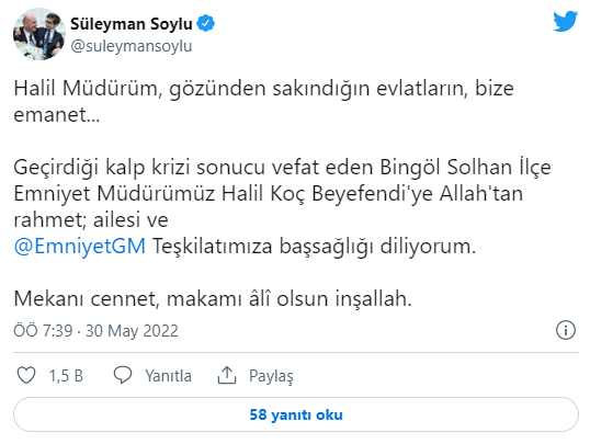 Geçirdiği kalp krizi sonucu vefat eden Bingöl Solhan İlçe Emniyet Müdürümüz Halil Koç Beyefendi'ye Allah'tan rahmet; ailesi ve Emniyet Teşkilatımıza başsağlığı diliyorum.
