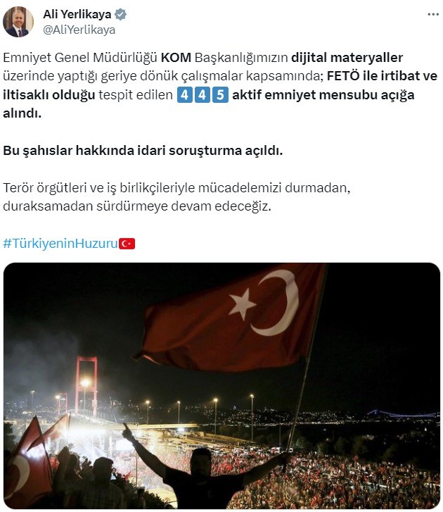 Konuya ilişkin sosyal medya hesabından açıklamada bulunan Bakan Yerlikaya, “Emniyet Genel Müdürlüğü KOM Başkanlığımızın dijital materyaller üzerinde yaptığı geriye dönük çalışmalar kapsamında; FETÖ ile irtibat ve iltisaklı olduğu tespit edilen 445 aktif emniyet mensubu açığa alındı. Bu şahıslar hakkında idari soruşturma açıldı. Terör örgütleri ve iş birlikçileriyle mücadelemizi durmadan, duraksamadan sürdürmeye devam edeceğiz” bilgisini paylaştı.