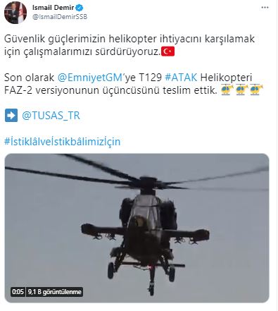 Savunma Sanayii Başkanı İsmail Demir, sosyal medya hesabından yaptığı paylaşımda, "Güvenlik güçlerimizin helikopter ihtiyacını karşılamak için çalışmalarımızı sürdürüyoruz. Son olarak Emniyet Genel Müdürlüğü'ne T129 Atak Helikopteri Faz-2 versiyonunun üçüncüsünü teslim ettik” denildi.
