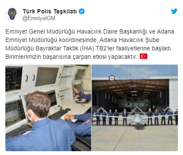 Emniyet Genel Müdürlüğü'nün Twitter hesabından yapılan açıklamada, "Emniyet Genel Müdürlüğü Havacılık Daire Başkanlığı ve Adana Emniyet Müdürlüğü koordinesinde, Adana Havacılık Şube Müdürlüğü Bayraktar Taktik İHA TB2'ler faaliyetlerine başladı. Birimlerimizin başarısına çarpan etkisi yapacaktır" ifadelerine yer verildi.