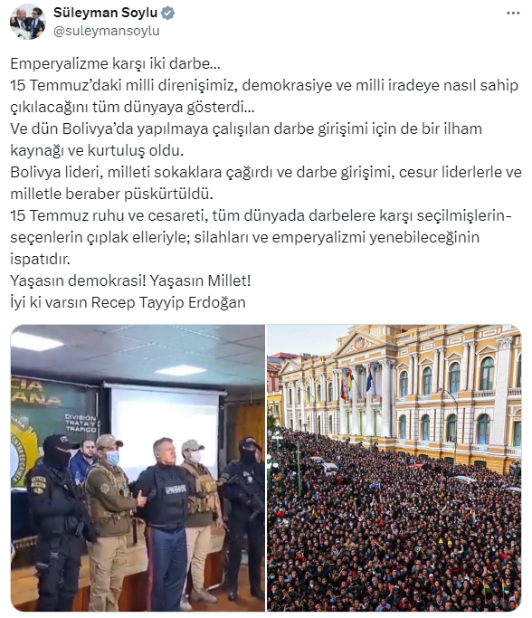 ABD uşaklarının Bolivya'daki darbe girişimi tıpkı Türkiye’deki ABD uşaklarınınki gibi başarısız oldu. Devlet Başkanı Luis Arce’ tıpkı Başkan Recep Tayyip Erdoğan’ın yaptığı gibi halkını meydanlara çağırdı. Bolivya’daki darbe girişimine karşı yapılan direniş, Eski İçişleri Bakanı Süleyman Soylu tarafından ‘Erdoğan, darbelere karşı çıplak elle direnişi öğretti’ şeklinde yorumlandı.