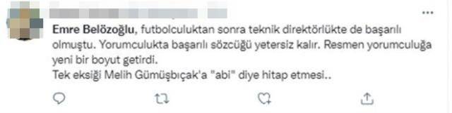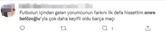 Bayern Münih'in Barcelona'yı 3-0 mağlup ettiği maçta yorumcu olarak görev alan Emre Belözoğlu, teknik bilgisi ve yerinde yorumlarıyla beğeni topladı. Ancak Belözoğlu'nun Melih Gümüşbıçak'a sürekli 'Melih ağabey' diye hitap etmesi, kamuoyu tarafından deneyimsizliğe bağlı eksiklik olarak yorumlandı.