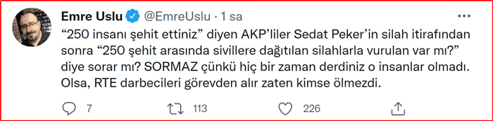 Sedat Peker’in iddiasının ardından FETÖ’nün ABD’deki firari köpeği Emre Uslu vakit kaybetmeden paylaşım yaptı. Uslu, ““250 insanı şehit ettiniz” diyen AKP’liler Sedat Peker’in silah itirafından sonra “250 şehit arasında sivillere dağıtılan silahlarla vurulan var mı?” diye sorar mı? SORMAZ çünkü hiç bir zaman derdiniz o insanlar olmadı. Olsa, RTE darbecileri görevden alır zaten kimse ölmezdi.” ifadelerini kullandı.