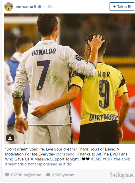 Borusia Dortmund'ta forma giyen milli futbolcu Emre Mor, 2-2'lik Real Madrid beraberliği sonrası kişisel Instagram hesabından Ronaldo hayranlığını dile getirdi. Mor, maç içerisinde Ronaldo ile aynı karede olduğu bir fotoğrafı "Hayatını hayal etme. Hayalini yaşa.. Bana her gün motivasyon kaynağı olduğun için teşekkürler Cristiano! Bize bu gece büyük destek veren Dortmund taraftarına da teşekkürler" yorumuyla paylaştı.
