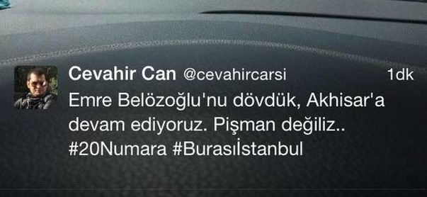 Beşiktaş taraftarı olduğunu belirten Cevahir Can isimli kişi, “Emre Belözoğlu’nu dövdük. Akhisar’a devam ediyoruz. Pişman değiliz” diye bir tweet attı. Can, gelen inanılmaz tepki üzerine bu tweetini sildi.
