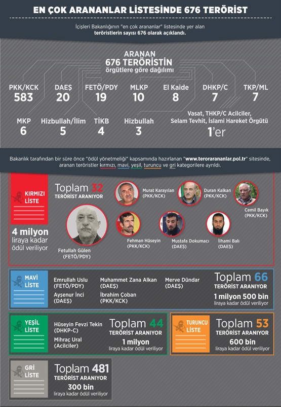 İçişleri Bakanlığının "en çok arananlar" listesindeki teröristlerin sayısı 676 olarak açıklandı, en çok arananların bulunduğu kırmızı kategoride FETÖ/PDY elebaşı Fethullah Gülen, bölücü terör örgütü PKK/KCK'dan Cemil Bayık, Murat Karayılan, Duran Kalkan, DAEŞ mensubu İlhami Balı ve "Dokumacılar Grubu"ndan Mustafa Dokumacı yer alıyor.