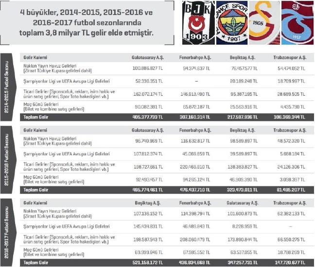 * Son 3 sezonda 4 büyük takım 3.8 milyar TL gelir elde etti.
