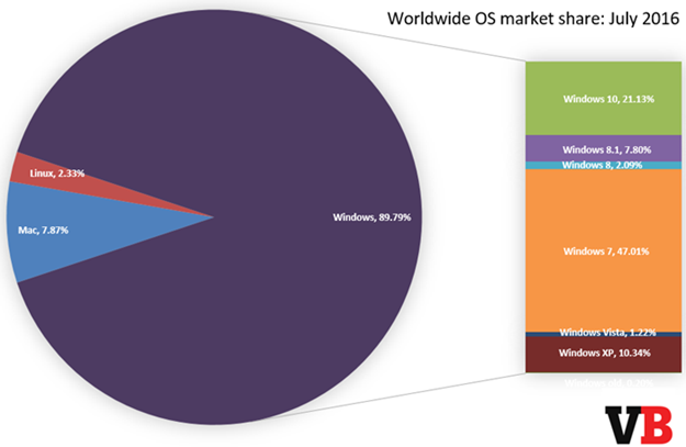 Diğer veriler Windows 7'nin hala en çok kullanılan Windows sürümü olduğunu gösteriyor. %47.01'lik kullanım oranına sahip olan işletim sistemi, Windows kullanıcılarının yarısından çoğu tarafından tercih ediliyor. Genel olarak bakıldığında Windows %89.79, Mac %7.87, Linux ise %2.33 kullanım oranına sahip.