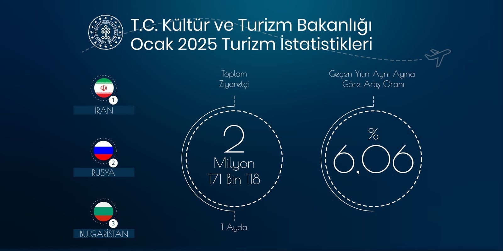 Türkiye, 2025 senesine güçlü bir başlangıç yaparak yılına turizmde güçlü bir başlangıç ocak ayında 2 milyon 171 bin 118 ziyaretçi ağırladı.