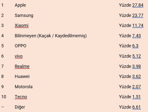 Verilere göre şubat ayında satılan telefonların yüzde 7.43‘ü, belirsiz bir markaya ait olarak kayıtlara geçti. Bu durum, kaçak ya da resmi kayıtlara geçirilmemiş telefon satışlarını işaret ediyor. Listenin devamında ise yüzde 6.3 ile OPPO, yüzde 5.12 ile vivo, yüzde 3.98 ile Realme, yüzde 3.98 ile Huawei, yüzde 2.07 ile Motorola ve yüzde 1.51 ile Tecno markalarını da görüyoruz. Sıralamaya aşağıdan ulaşabilirsiniz.