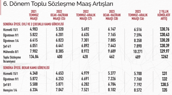6. dönem toplu sözleşme süreci uzlaşı ile sonuçlanmıştı. 4 milyon memur ve 2 milyondan fazla memur emeklisini ilgilendiren zam oranları belli oldu. Memur ve memur emeklisinin maaşına 2022'nin ilk altı ayı yüzde 5, ikinci altı ayı yüzde 7 artış yapıldı. Artış, 2023'ün ilk altı ayı yüzde 8, ikinci altı ayı yüzde 6 oldu. Çalışma ve Sosyal Güvenlik Bakanı Vedat Bilgin, "Türkiye tarihinde yapılmış en yüksek oranları içeren sözleşme" dedi. Memur-Sen Genel Başkanı Ali Yalçın ise maaşlarda yüzde 28 iyileştirme olduğunu söyledi.
