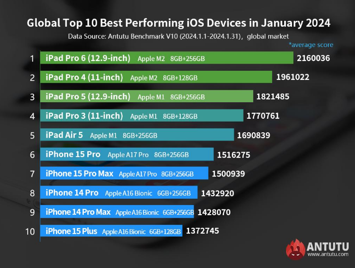 AnTuTu’ya göre ocak ayının en hızlı Apple cihazı 2 milyon 160 bin 036 puanla 12.9 inç iPad Pro 6 oldu. Son dönemde zirveye adeta demir atan tableti 1 milyon 961 bin 22 puanla kardeşi 11 inç iPad Pro 4 takip etti. Listenin üçüncü sırasında da geçen aylara damga vuran ve uzun süre zirveden inmeyen 12.9 inç iPad Pro 5 yer alıyor. 1 milyon 821 bin 485 puan alan cihazın ardından 1 milyon 770 bin 761 puanla 11 inç iPad Pro 3 geliyor.