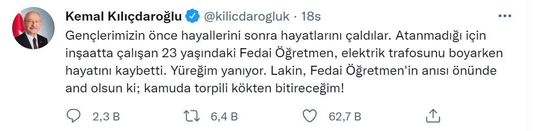 Bu durumu fırsat bilen CHP Genel Başkanı Kemal Kılıçdaroğlu, sosyal medya hesabından ‘torpili bitireceğim’ naraları atmaya başladı. CHP lideri “Gençlerimizin önce hayallerini sonra hayatlarını çaldılar. Atanmadığı için inşaatta çalışan 23 yaşındaki Fedai Öğretmen, elektrik trafosunu boyarken hayatını kaybetti. Yüreğim yanıyor. Lakin, Fedai Öğretmen'in anısı önünde and olsun ki; kamuda torpili kökten bitireceğim!” ifadelerini kullandı.
