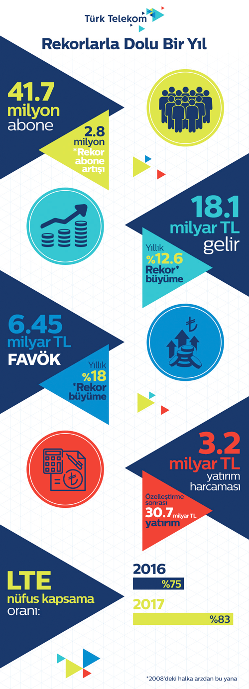 Türk Telekom rekorlarla dolu 2017 yılsonu finansal sonuçlarını açıkladı. Abone sayısında 41 milyonu geçen şirket, elde ettiği gelir ve kârlılıkla da moral bulurken, yaptığı kampanya ve yatırımlarla da dikkat çekti.