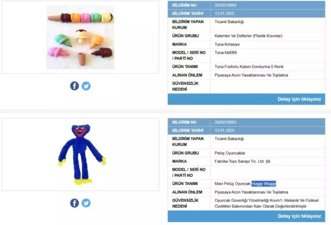 Bakanlığın son duyurusunda 2 oyuncak için piyasadan toplatılma kararı verildi. Bunlardan ilki "Tuna Fosforlu Kalem" olurken, ikincisi ise "Huggy Wuggy" karakterine ait olan pelüş oyuncak oldu. Her iki ürününde piyasaya arzı yasaklandı ve toplatılma kararı alındı.