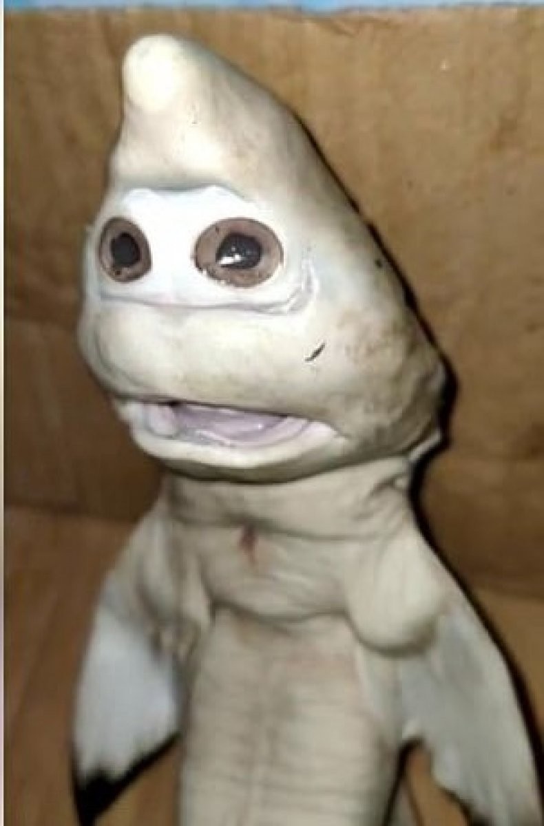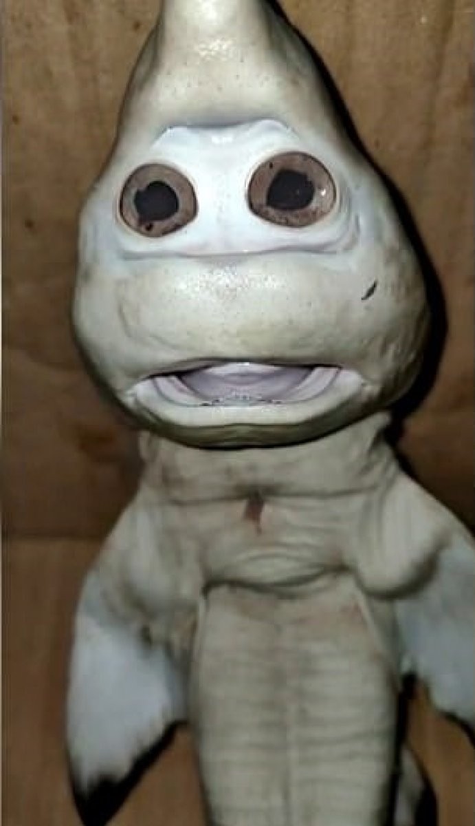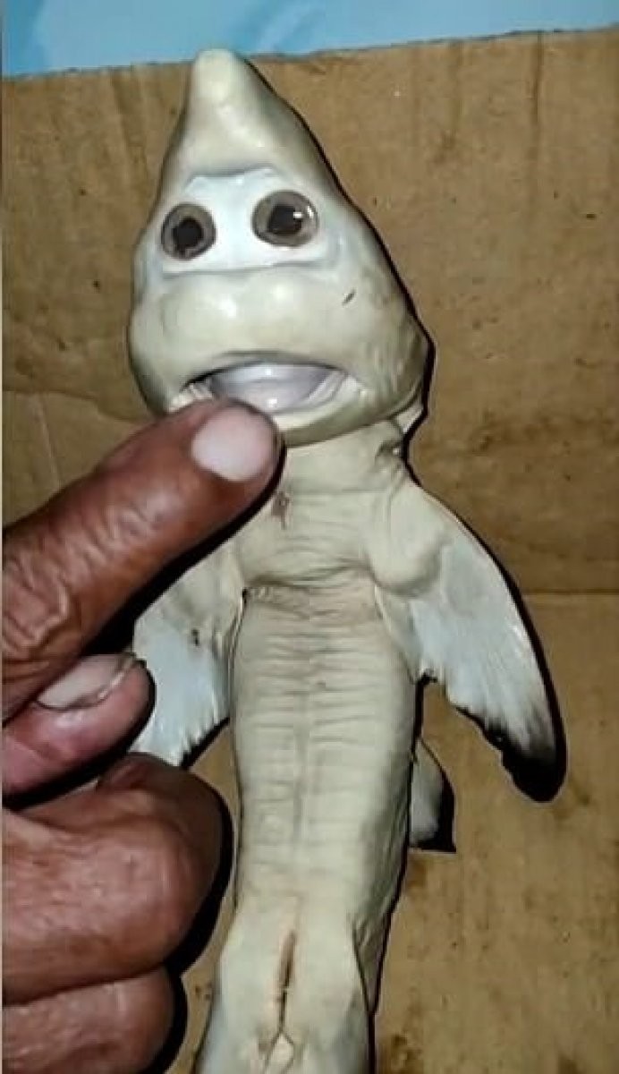 Denize açılan bir balıkçı, annesinin karnından çıkan insan yüzlü bir köpek balığının görüntülerini paylaşarak, mutasyona uğrayan balığın kendisine şans getireceğini söyledi.