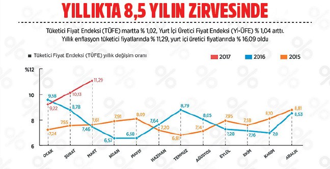 TÜFE, geçen yılın aralık ayına göre yüzde 4,34, geçen yılın aynı ayına göre yüzde 11,29 yükselerek 2008 yılından bu yana en yüksek düzeye çıktı. Yıllık yüzde 5 enflasyon hedefi bulunan Türkiye, daha 3 aylık sürçte bu rakamı neredeyse yakaladı.
