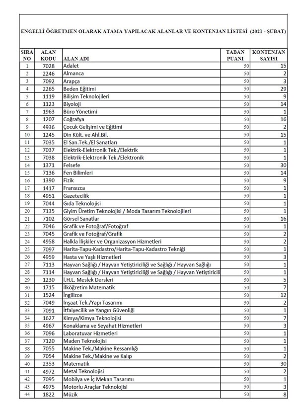 Milli Eğitim Bakanlığının (MEB) internet sitesindeki duyuruya göre, 2018-2020 yıllarındaki EKPSS'ye katılanlar arasından atama yapılmak üzere 1-5 Şubat'ta ön başvurular alındı. Atama yapılacak alan ve kontenjan sayıları, tercih başvurularının ilk günü olan 11 Şubat'ta "personel.meb.gov.tr" adresinde yayımlandı. Engelli öğretmen ataması için adaylar, ön başvuruda bulundukları alanda kontenjan verilmesi halinde tercih başvurularını "personel.meb.gov.tr" adresinde yer alan Elektronik Tercih Başvuru Formunu doldurmak suretiyle 15 Şubat'a kadar yapabilecek.