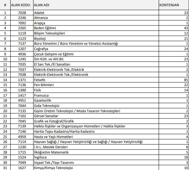 Yapılan duyuruda “Adayların tercihine açılacak alanlar ve il bazlı kontenjan sayıları, ülke geneli alanlar itibarıyla öğretmen ihtiyacı ve illerin alanlar bazındaki boş norm sayıları ve öğretmen ihtiyacı göz önünde bulundurularak Bakanlıkça belirlenecektir. 2. Atama yapılacak alan ve kontenjan sayıları, tercih başvurularının ilk günü olan 22 Kasım 2021 tarihinde personel.meb.gov.tr adresinde yayımlanacaktır” ifadeleri yer aldı.