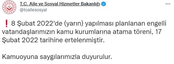 Bakanlığın resmi sosyal medya hesabı üzerinden yaptığı açıklamada, “8 Şubat 2022'de (yarın) yapılması planlanan engelli vatandaşlarımızın kamu kurumlarına atama töreni, 17 Şubat 2022 tarihine ertelenmiştir. Kamuoyuna saygılarımızla duyurulur” ifadeleri kullanıldı.