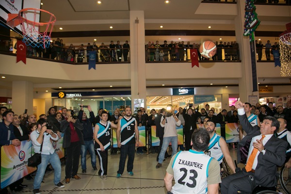 Küçükçekmece Belediyesi’nin Türkiye’nin ilk engelsiz AVM’si olma özelliğine sahip Armoni Park AVM’de 3 Aralık Engelliler Günü’ne özel gerçekleştirdiği etkinlikte, TÜREV Spor Engelli Basketbol Takımı ile Küçükçekmece İlçe Kaymakamı Harun Kaya, Küçükçekmece Belediye Başkanı Temel Karadeniz, Ak Parti İlçe Başkanı Av. Mustafa Korkut ve Armani Park Genel Müdürü Fethi Başuslu maç yaptı.