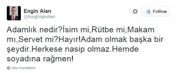 İsim vermeden Türkeş'i eleştiren Alan, Twitter hesabından yaptığı paylaşımda, "Adamlık nedir? İsim mi, rütbe mi, makam mı, servet mi? Hayır! Adam olmak başka bir şeydir. Herkese nasip olmaz. Hem de soyadına rağmen!" şeklinde ifadeler kullandı.