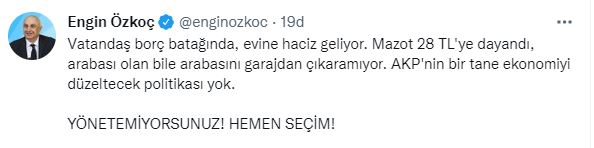 Özkoç sosyal medya hesabı üzerinden yaptığı paylaşımda, “Vatandaş borç batağında, evine haciz geliyor. Mazot 28 TL'ye dayandı, arabası olan bile arabasını garajdan çıkaramıyor. AKP'nin bir tane ekonomiyi düzeltecek politikası yok. YÖNETEMİYORSUNUZ! HEMEN SEÇİM!” ifadelerini kullandı.