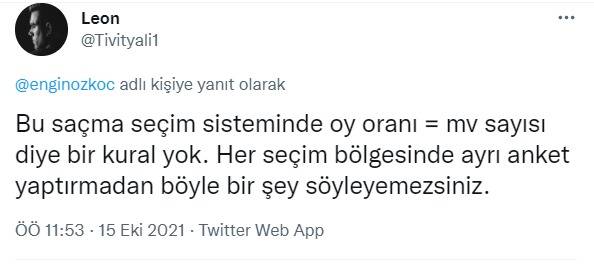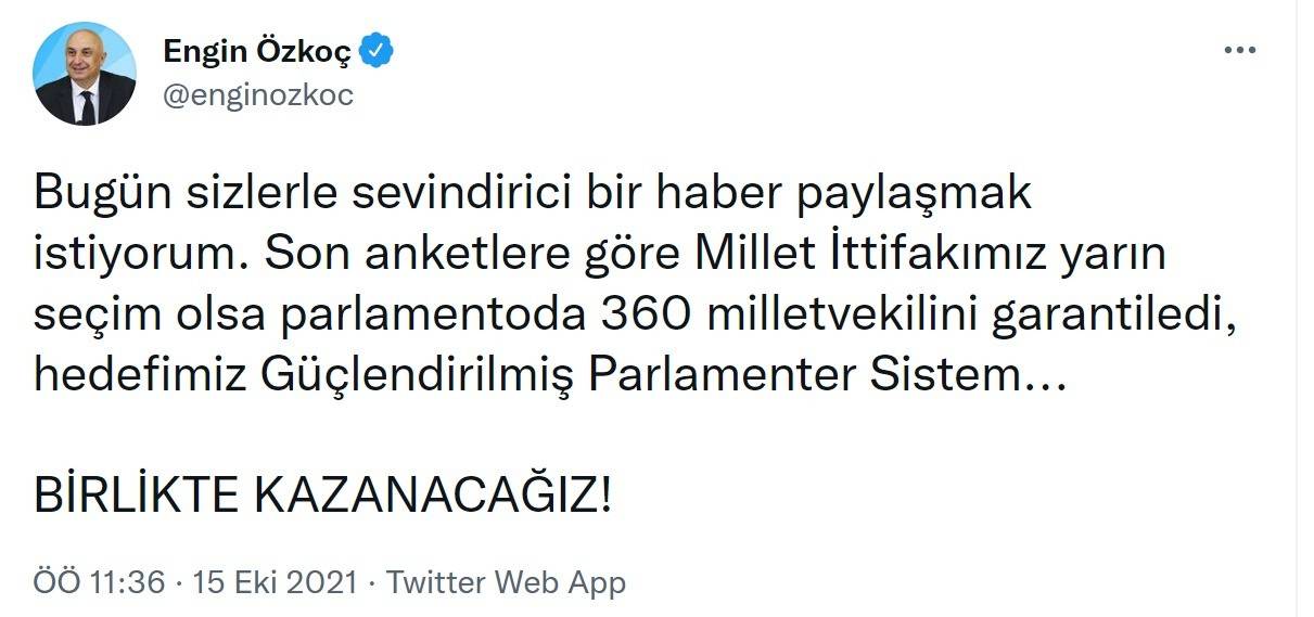 Twitter hesabından açıklamada bulunan Özkoç, son anket sonuçlarına göre Millet İttifakı'nın 360 milletvekilini garantilediğini söyledi. Özkoç'un, paylaştığı sonucun hangi şirkete ait olduğunu söylememesi dikkatlerden kaçmadı.