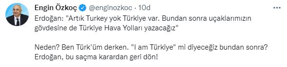 Özkoç sosyal medya hesabı üzerinden yaptığı paylaşımda, “Erdoğan: ‘Artık Turkey yok Türkiye var. Bundan sonra uçaklarımızın gövdesine de Türkiye Hava Yolları yazacağız’ Neden? Ben Türk'üm derken. ‘I am Türkiye’ mi diyeceğiz bundan sonra? Erdoğan, bu saçma karardan geri dön!” ifadelerini kullandı.