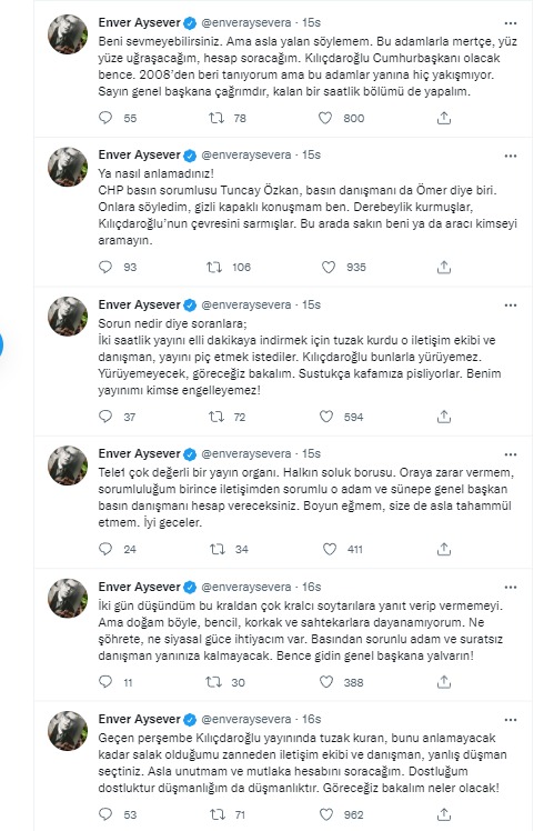 CHP'li belediyelerden aldığı ihalelerle cebini dolduran CHP yandaşı Enver Aysever, Kılıçdaroğlu ile yaptığı yayının sabote edildiğini ve CHP'li Tuncay Özkan ile Ömer Topsakal tarafından kendisine tuzak kurulduğunu iddia etti.