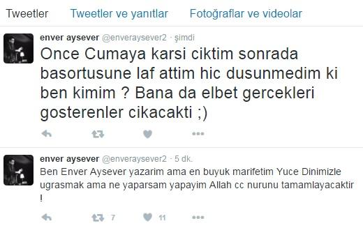 Aysever’e yönelik tweetler atılan hesaptan, “Ben Enver Aysever yazarım ama en büyük marifetim yüce dinimizle uğraşmak ama ne yaparsam yapayım Allah cc nurunu tamamlayacaktır! Önce Cumaya karşı çıktım sonrada başörtüsüne laf attım hiç düşünmedim ki ben kimim? Bana da elbet gerçekleri gösterenler çıkacaktı ;)” ifadeleri paylaşıldı.