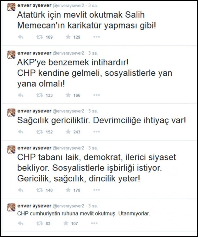 Daha önce attığı nefret dolu tweetlerle adından sıkça bahsettiren Enver Aysever, ölüm yıl dönümü sebebiyle M.Kemal icin mevlitokutan CHP'liler hakkında Twitter'daki hesabında şu ifadeleri kullandı: "CHP Cumhuriyet'in ruhuna mevlit okutmuş. Utanmıyorlar."