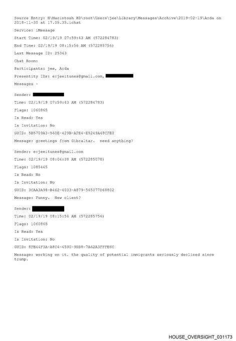 Belgede yer alan iMessage kayıtları, "Arda" isimli bir şahıs ile bizzat Jeffrey Epstein (jeeitunes) arasındaki diyaloğu belgeliyor. 19 Şubat 2019 tarihli yazışmada Arda, Cebelitarık’tan Epstein’e "Bir şeye ihtiyacın var mı?" diye sorarken, Epstein’in cevabı bu ağın niteliğini özetliyor: "Komik. Yeni müşteri mi?"