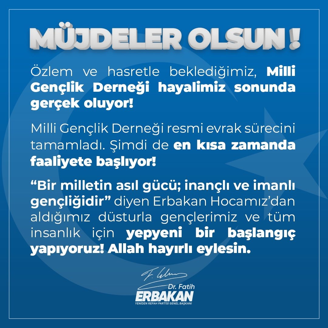 Fatih Erbakan Twitter hesabından yaptığı paylaşımda, Milli Gençlik Derneği'nin resmi evrak sürecini tamamladığını duyurdu.
